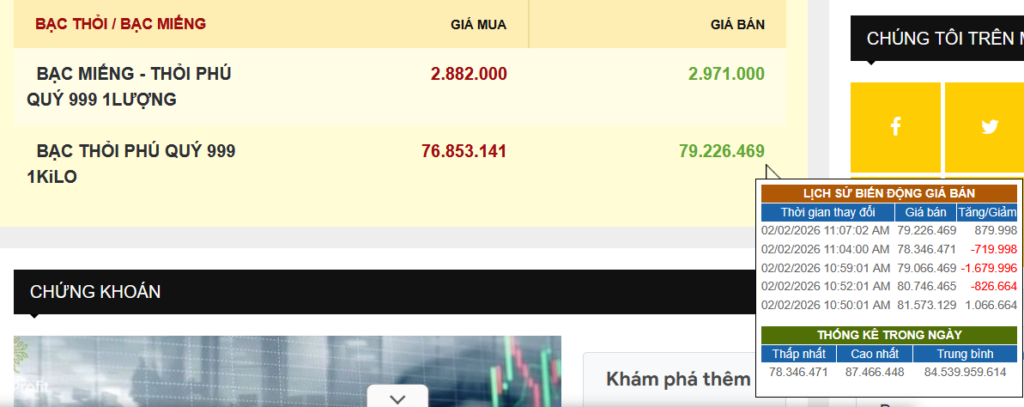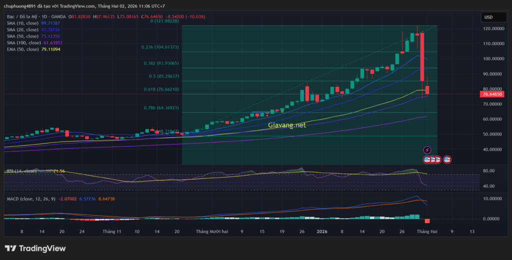 Trong phiên châu Á, bạc dao động dưới vùng 80 USD/ounce, hồi phục nhẹ sau khi rơi xuống mức thấp nhất trong 4 tuần tại 73,33 USD vào cuối tuần trước. Tuy nhiên, đà phục hồi vẫn khá mong manh sau cú “rơi tự do” mạnh, khiến giá bạc mất hơn 30% so với đỉnh lịch sử 121,66 USD.