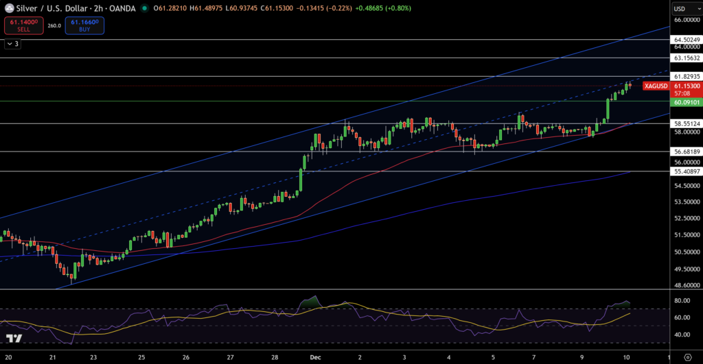 - Bạc đang chạm biên trên của kênh tăng, sau cú bật mạnh từ $58,55.