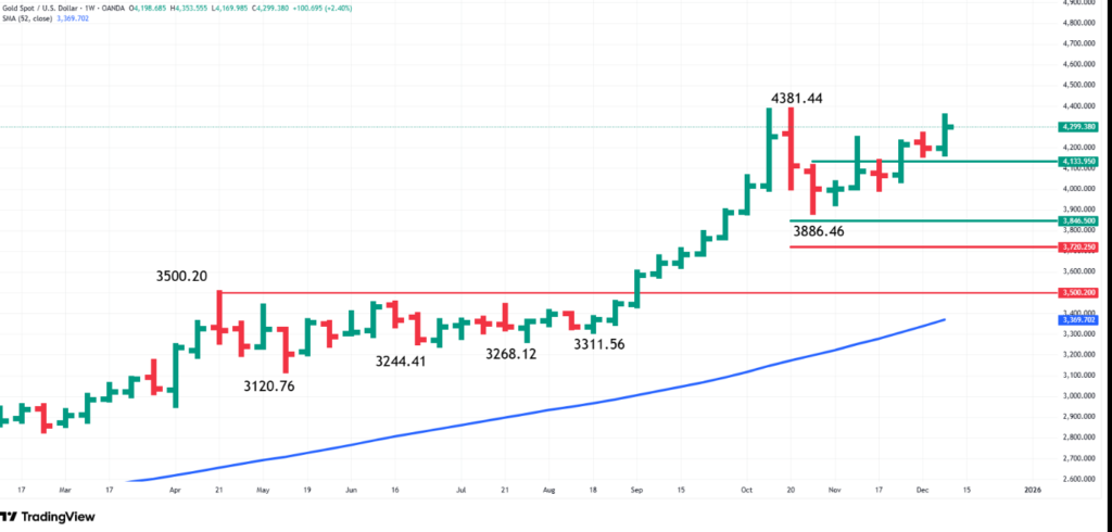 - Cấu trúc tăng giá theo tuần vẫn được bảo toàn trên $4.133,95, mở ra khả năng kiểm định lại đỉnh $4.381,44.