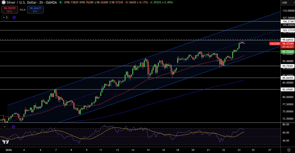 Giá bạc đang giao dịch quanh 98,55 USD, tạm chững lại sau nhịp tăng đều đặn trong kênh giá tăng rõ ràng trên khung 2 giờ.