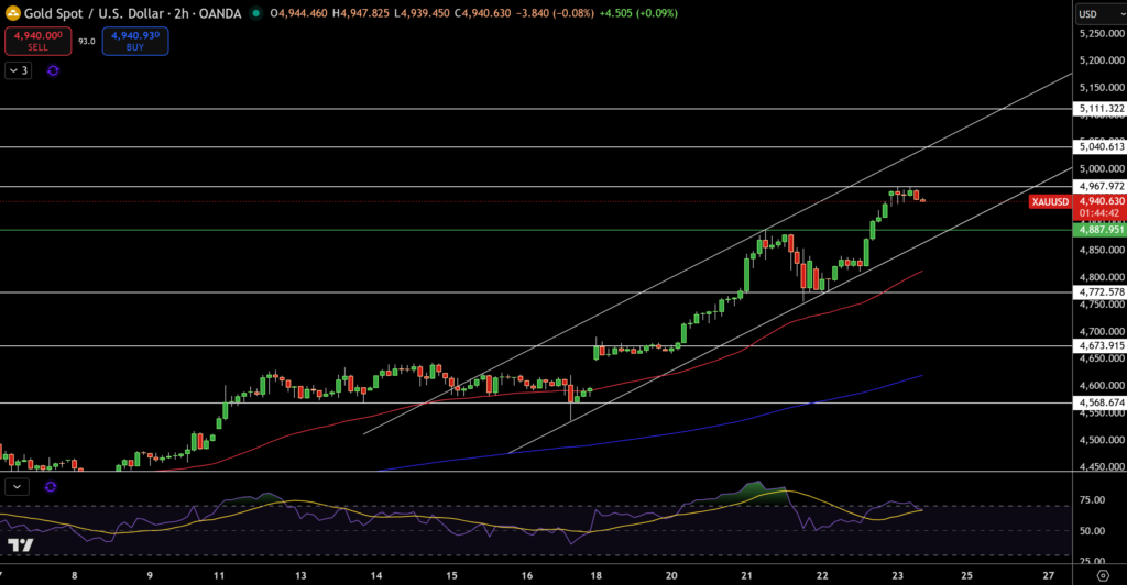 Giá vàng hiện giao dịch quanh 4.940 USD, điều chỉnh nhẹ sau nhịp tăng mạnh trong kênh giá tăng dần trên khung 2 giờ.