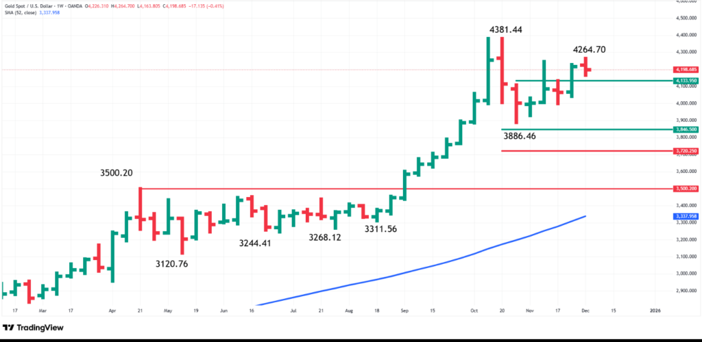 Trong tuần 1–5/12, vàng giao ngay đóng cửa ở $4.198,68, giảm nhẹ 0,41% và dao động trong biên độ hẹp $4.163,80 – $4.264,70. Dù biến động thấp, lực mua vẫn hiện diện ổn định: