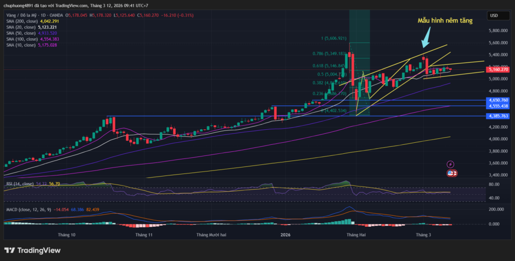 Mô hình kỹ thuật hiện tại cho thấy giá vàng đang trong giai đoạn tạm nghỉ sau cú giảm mạnh, với khả năng hình thành một nhịp giảm thứ hai nếu các mốc hỗ trợ quan trọng bị phá vỡ.