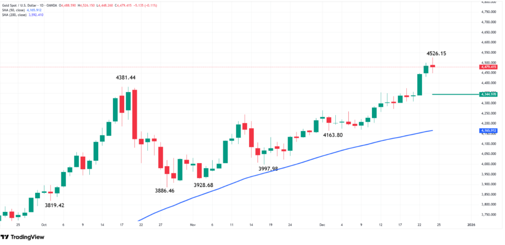 Trong phiên ngày 25/12/2025, giá vàng giao ngay đóng cửa giảm nhẹ, hình thành mô hình “đỉnh đảo chiều đóng cửa” (closing price reversal top) trên đồ thị ngày. Cụ thể, XAU/USD chốt phiên tại 4.479,41 USD/oz, giảm 5,13 USD (-0,11%).