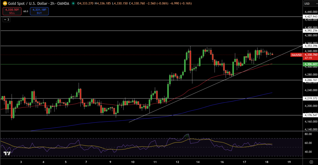 Trên khung 2 giờ, giá vàng đang giao dịch quanh $4.331, đi ngang sau khi không thể bứt phá vùng kháng cự $4.350 – $4.360. Các nến có thân nhỏ và bóng trên cho thấy tâm lý lưỡng lự, chưa xuất hiện áp lực bán mạnh.