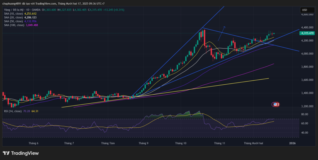Mặc dù động lượng tăng giá của vàng chưa thực sự bùng nổ, nhưng cấu trúc xu hướng vẫn nghiêng rõ rệt về phe mua. Vàng tiếp tục là một trong những tài sản mạnh nhất năm 2025, nhờ kỳ vọng chính sách tiền tệ nới lỏng và nhu cầu trú ẩn.