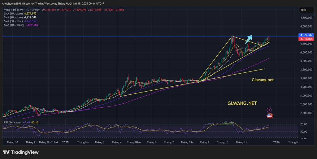 Trong phiên giao dịch ngày 18/12, giá vàng đã thiết lập đỉnh ngắn hạn mới tại 4.375 USD/ounce, tuy nhiên lực mua không đủ mạnh để duy trì đà tăng. Ngay sau đó, kim loại quý nhanh chóng bị bán tháo và quay đầu giảm, giao dịch dưới mốc 4.353 USD – mức đỉnh cũ quan trọng.