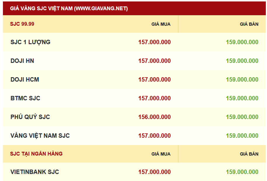Bảng giá vàng