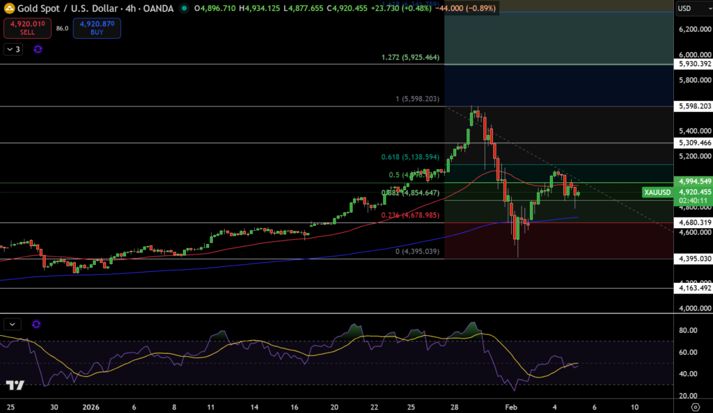 • Giá vàng hiện dao động quanh $4.900 – $4.920, sau khi giảm mạnh từ đỉnh $5.600