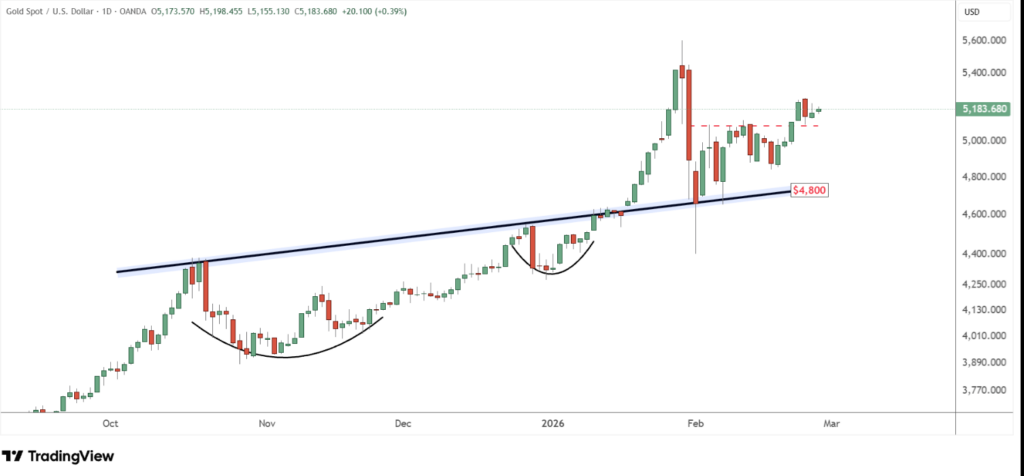 Về kỹ thuật, giá vàng đang duy trì cấu trúc tăng giá quanh mốc 4.800 USD/ounce và đã bứt phá lên trên 5.100 USD. Xu hướng trung hạn vẫn nghiêng về tăng nếu rủi ro địa chính trị chưa hạ nhiệt.