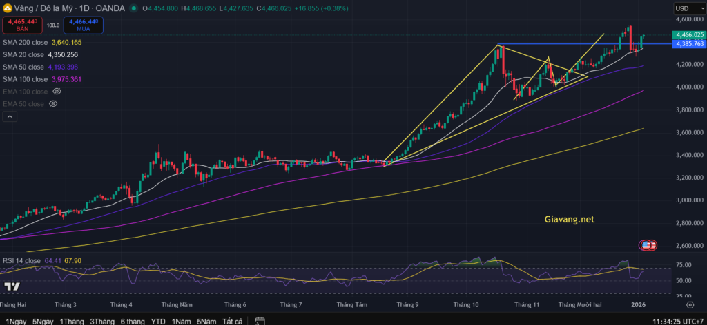 - SMA 20 kỳ đang hướng lên, nằm quanh 4.370 USD