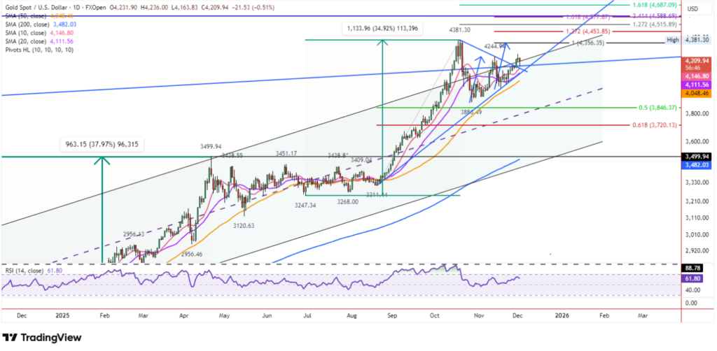 Nhịp giảm về $4164 chỉ là một đợt “pullback khỏe mạnh”, tôn trọng hỗ trợ xu hướng dài hạn. Xu hướng tăng vẫn rõ ràng và mạnh mẽ. Giữ được $4205 và vượt lại vùng $4245–$4264, vàng sẽ hướng đến $4356 và xa hơn là $4454.