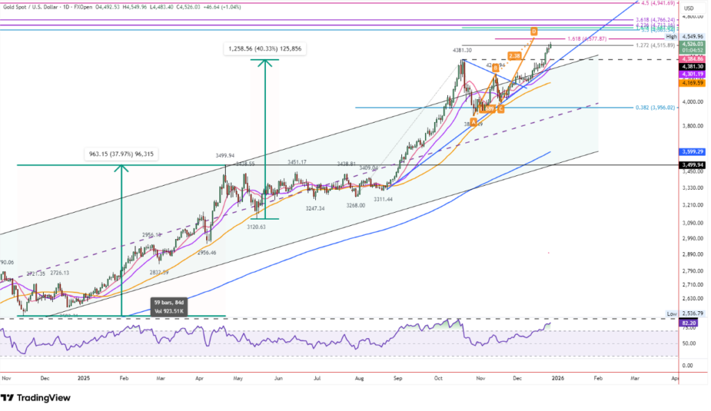 Trong phiên cuối tuần, vàng tăng vọt lên 4.550 USD, mức cao nhất mọi thời đại, đồng thời có khả năng đóng cửa ở mức cao lịch sử. Việc hình thành đỉnh cao hơn và đáy cao hơn trên biểu đồ ngày tiếp tục xác nhận người mua vẫn chiếm ưu thế.