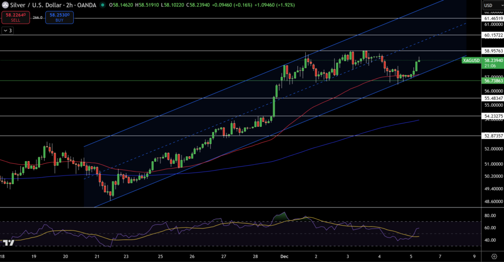 Bạc đang ở quanh $58,23, tiếp tục duy trì trong kênh tăng giá bắt đầu từ cuối tháng 11. Sau nhịp chạm đáy kênh tại $56,74, giá bật lại và vượt lên EMA 20 – dấu hiệu phục hồi tốt.