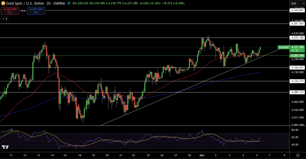 Giá vàng đang giao dịch quanh $4.227, nằm trên đường xu hướng tăng hình thành từ cuối tháng 11. Các cây nến 2 giờ gần đây cho thấy chuỗi higher lows, phản ánh lực mua ổn định.