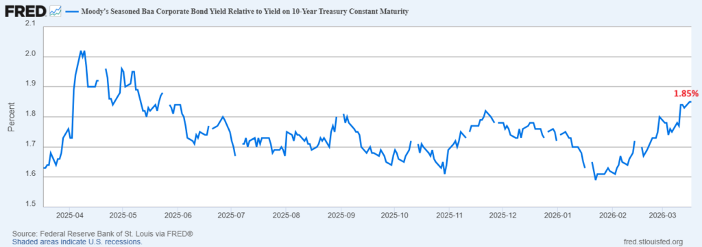 Một yếu tố quan trọng khác là điều kiện tài chính đang xấu đi. Chênh lệch lợi suất trái phiếu doanh nghiệp (credit spread) gia tăng cho thấy chi phí vay vốn tăng và khẩu vị rủi ro suy giảm.