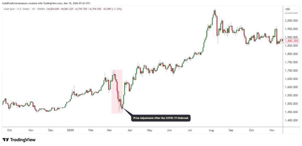 Trong giai đoạn khủng hoảng Đại dịch COVID-19, giá vàng từng giảm mạnh trong ngắn hạn trước khi tăng vọt lên đỉnh mới chỉ vài tháng sau đó.