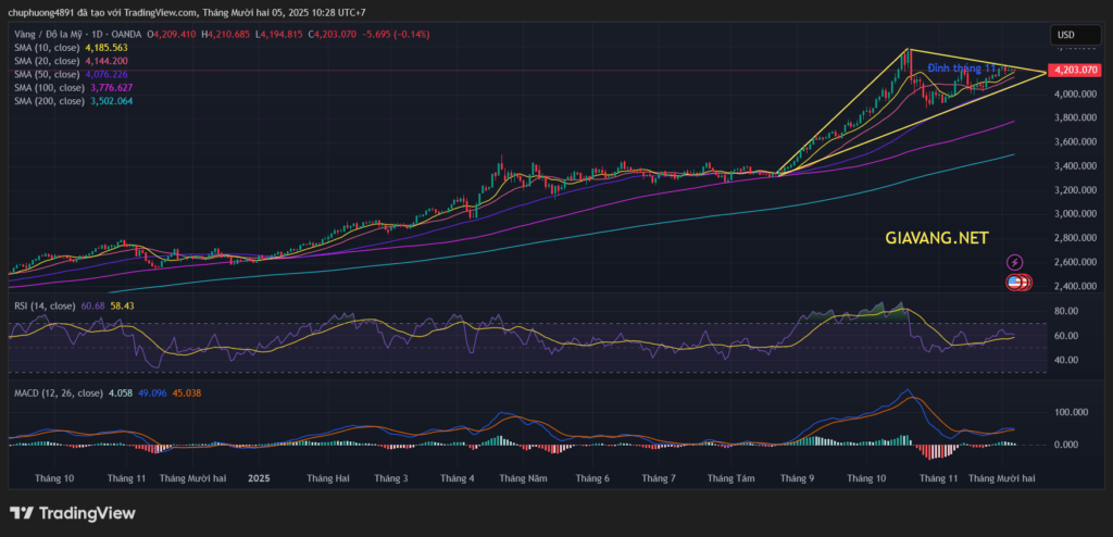 👉 Ý nghĩa: Xu hướng tăng vẫn được duy trì, vàng đang “nén lực” và có thể sớm tạo cú bứt phá mới.