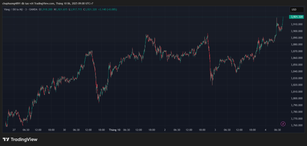 (GVNET) Giá vàng tiếp tục bứt phá lên mức kỷ lục mới, tiến gần mốc 4.000 USD/ounce, trong bối cảnh chính phủ Mỹ vẫn chưa thể chấm dứt tình trạng đóng cửa và thị trường toàn cầu ngập tràn lo ngại về triển vọng kinh tế.
