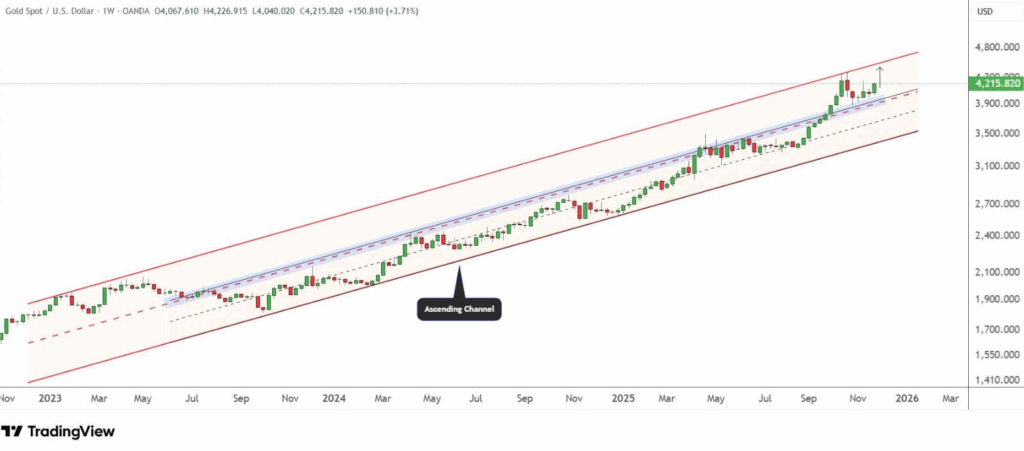 Vàng tiếp tục di chuyển trong kênh tăng giá dài hạn, bật mạnh từ vùng trung tuyến quanh 4.000 USD, ghi nhận mức tăng tuần 3,71%.