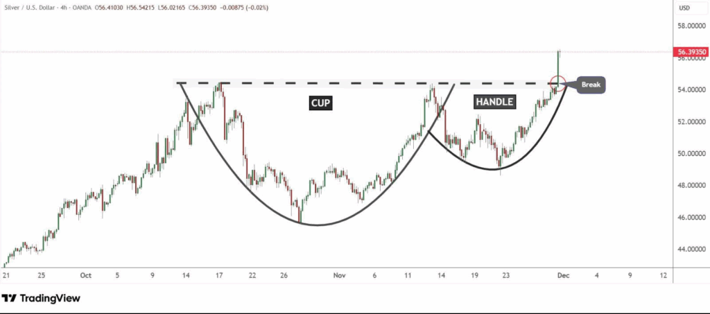 Biểu đồ 4H cho thấy mô hình cup and handle hoàn chỉnh, breakout neckline 54 USD.