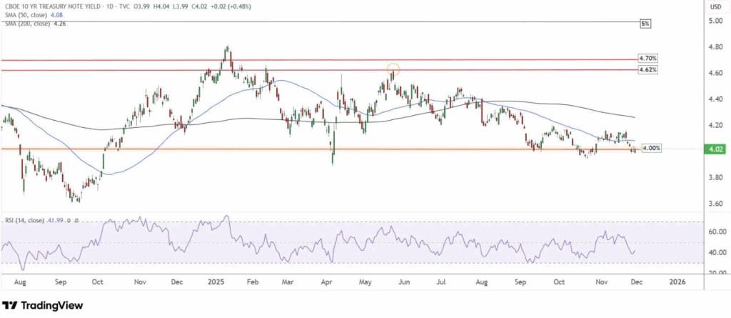 Lợi suất trái phiếu 10 năm đã trượt về vùng 4%, phản ánh kỳ vọng cắt giảm lãi suất vào tháng 12. Những yếu tố này tạo nền móng vững chắc cho một chu kỳ tăng mới của vàng vào năm 2026.