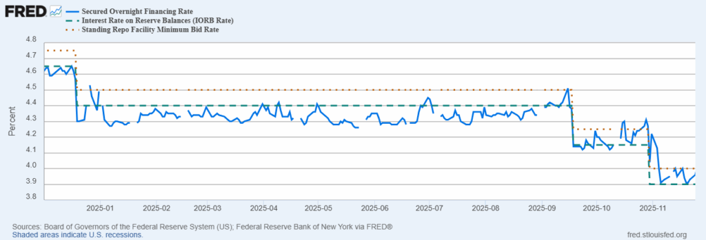 Trong khi chứng khoán và tài sản rủi ro yếu đi, Bitcoin vẫn nằm trong vùng giảm. Thị trường repo căng thẳng khi SOFR duy trì trên 3,9%, cho thấy thiếu thanh khoản – một môi trường truyền thống hỗ trợ giá vàng.