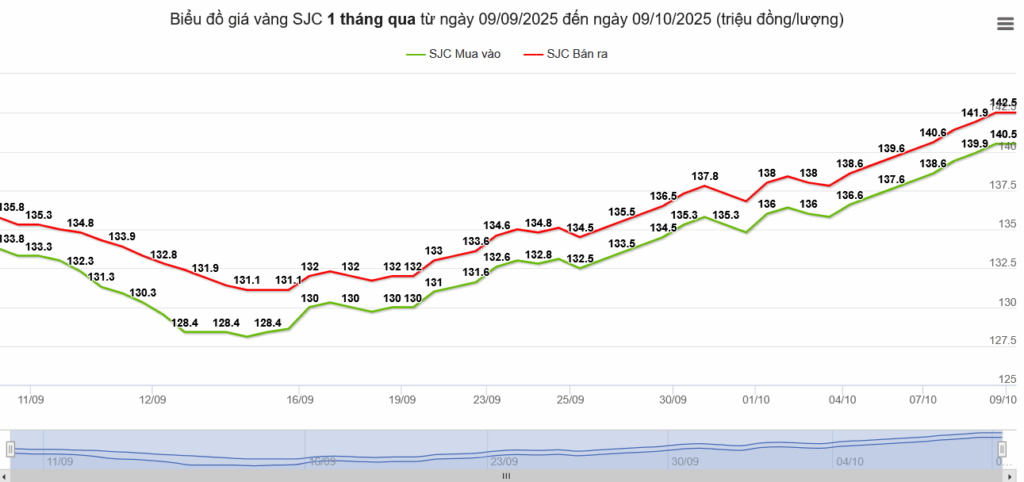Trước thời điểm 10/10, giá vàng trong nước đã lập đỉnh cao mới. Vào ngày 8/10, giá vàng miếng SJC niêm yết đạt khoảng 140,5 – 142,5 triệu đồng/lượng (mua – bán).