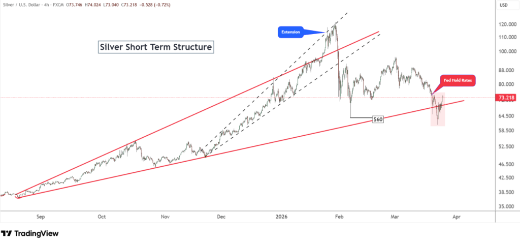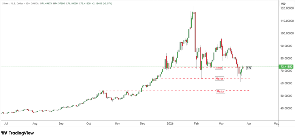 Giá bạc (XAG/USD) cũng ghi nhận đà phục hồi tích cực, tuy nhiên mức độ biến động lớn hơn do chịu ảnh hưởng kép từ yếu tố tiền tệ và nhu cầu công nghiệp.