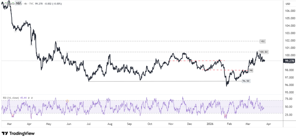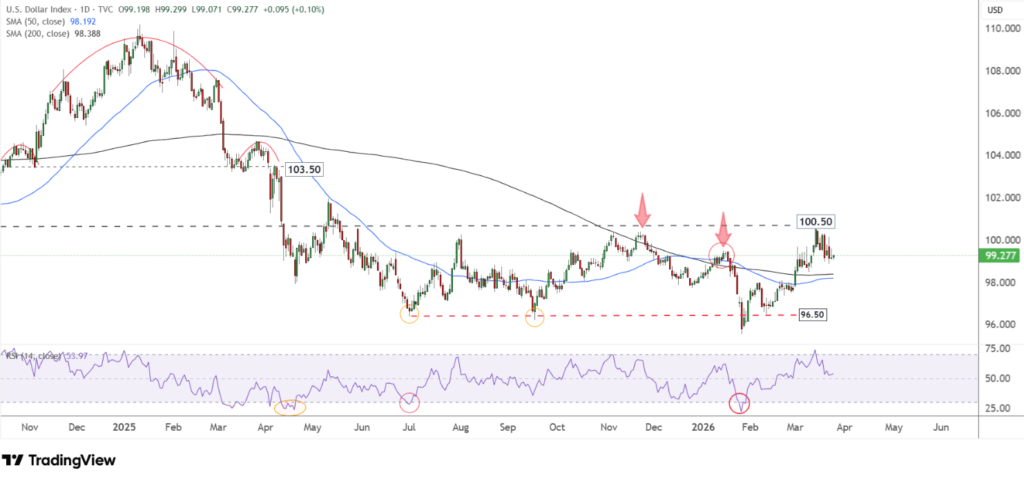 Nếu USD vượt 100.50 → gây áp lực giảm lên vàng