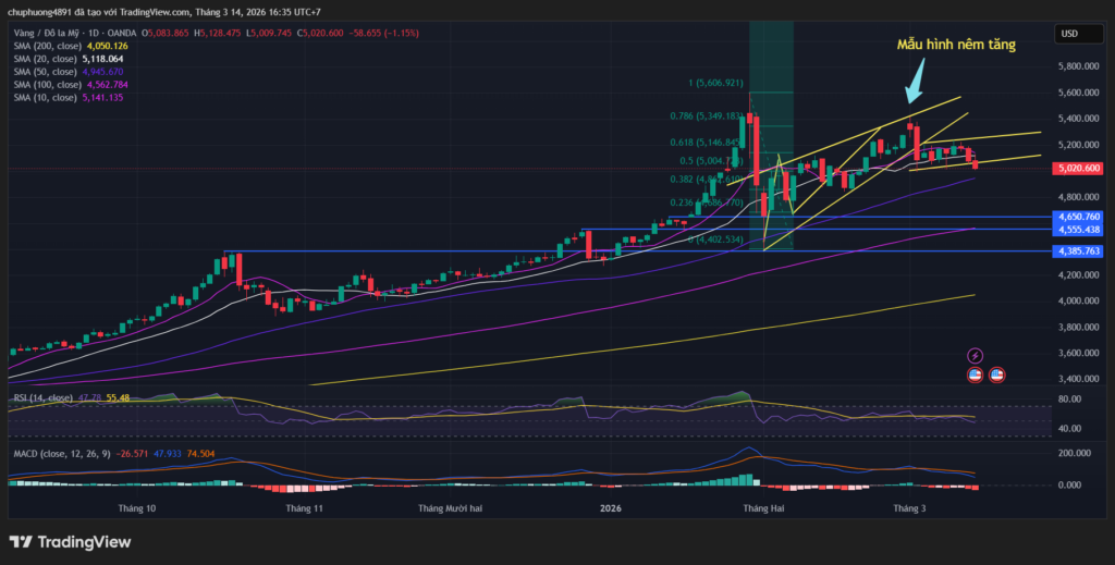 - Tín hiệu giảm đầu tiên xuất hiện khi giá rơi dưới 5.015 USD.