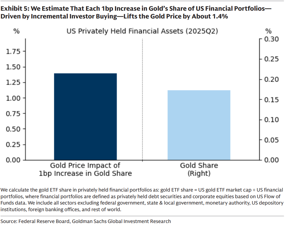 Hiện tại, các quỹ ETF vàng chỉ chiếm khoảng 0,17% danh mục tài chính của nhà đầu tư Mỹ, thấp hơn nhiều so với đỉnh năm 2012. Theo tính toán của Goldman Sachs, mỗi khi tỷ trọng vàng tăng thêm 1 điểm cơ bản trong danh mục tài chính của nhà đầu tư Mỹ, giá vàng có thể tăng thêm khoảng 1,4%.