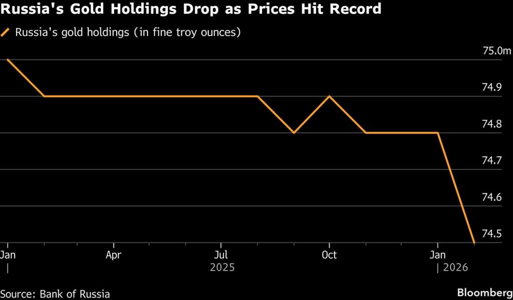 Theo dữ liệu mới nhất từ Ngân hàng Trung ương Nga (CBR), Nga đã giảm lượng vàng nắm giữ xuống còn 74,5 triệu ounce sau khi bán ra 300.000 ounce trong tháng 1. Đây là lần đầu tiên dự trữ vàng của Nga sụt giảm kể từ tháng 10 năm ngoái.