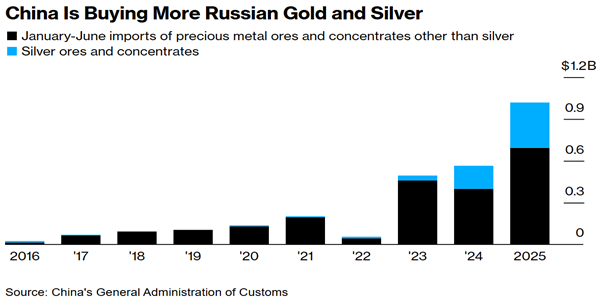 Báo cáo trước đó của Bloomberg cho biết, trong nửa đầu năm 2025, giá trị xuất khẩu kim loại quý của Nga sang Trung Quốc gần như tăng gấp đôi.