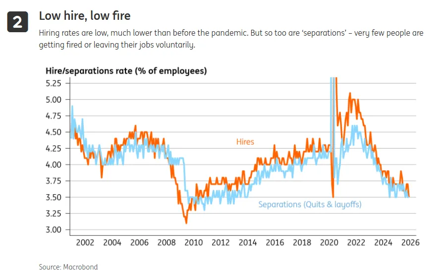 • Bối cảnh: Sau giai đoạn biến động mạnh cuối năm 2025, thị trường lao động Mỹ đang có dấu hiệu chuyển sang trạng thái “low-hire, low-fire” – tuyển dụng thấp nhưng cũng không sa thải ồ ạt.
