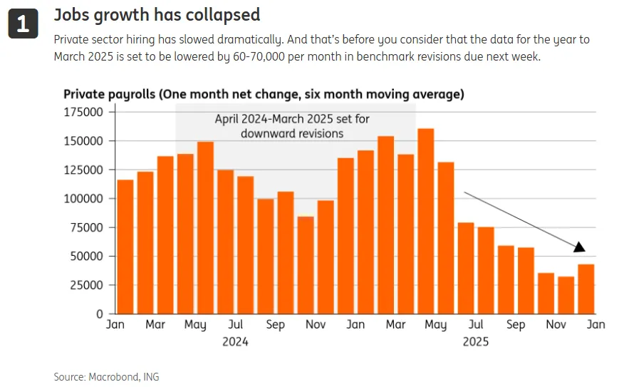 Đáng chú ý, thị trường đang kỳ vọng benchmark revisions có thể bị điều chỉnh giảm khoảng 60.000 – 70.000 việc làm, hàm ý Fed có thể đã duy trì chính sách tiền tệ thắt chặt “quá lâu”.