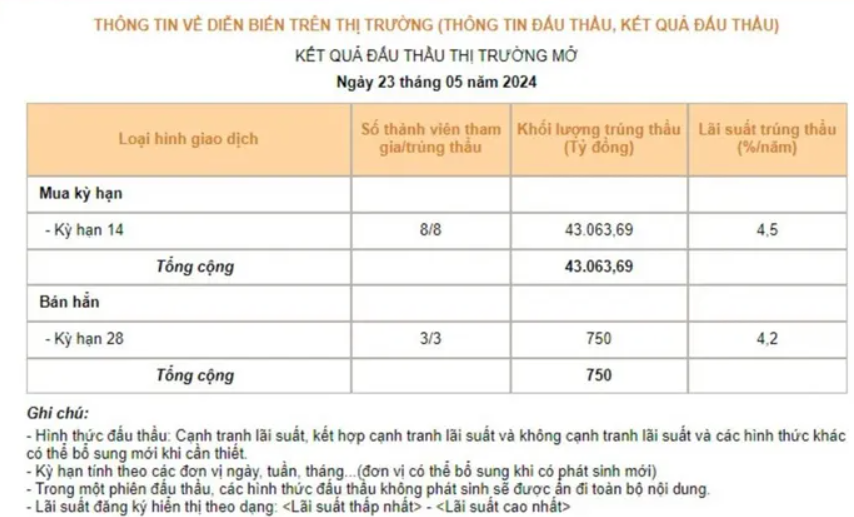 (GVNET) – Ngày 23/5, Ngân hàng Nhà nước (NHNN) đã cho 8 thành viên vay tổng cộng gần 43.064 tỷ đồng qua kênh cho vay cầm cố giấy tờ có giá (OMO) với lãi suất 4,5%/năm, kỳ hạn 14 ngày. Mức vay này được xem là lớn nhất trong nhiều năm trở lại đây.