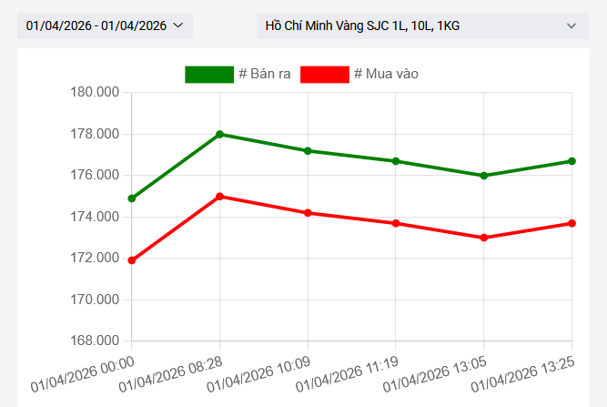 Cập nhật thời điểm 14h10 ngày 1/4, vàng miếng SJC Hồ Chí Minh niêm yết giao dịch mua – bán ở mức 173,7 – 176,7 triệu đồng/lượng, giá mua tăng 1,8 triệu và giá bán tăng 1,8 triệu so với cuối ngày hôm qua. Biến động giá SJC từ đầu giờ sáng nay gồm cả nhịp tăng.