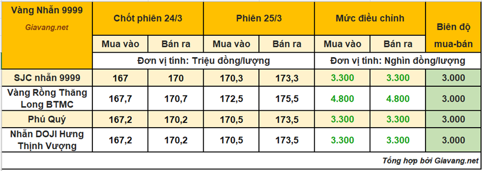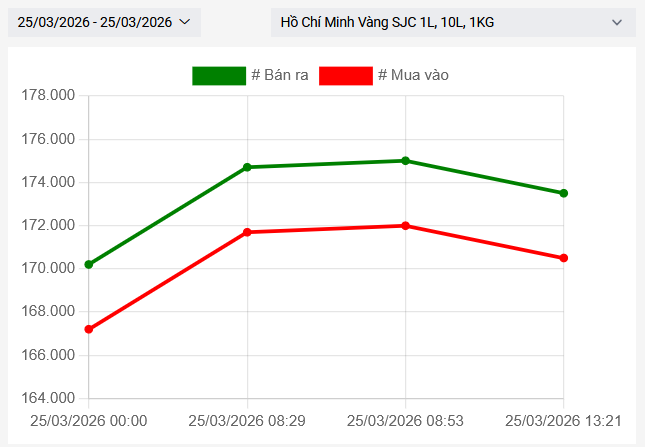 Cập nhật thời điểm 18h00 ngày 25/3, vàng miếng SJC Hồ Chí Minh niêm yết giao dịch mua – bán ở mức 170,5 – 173,5 triệu đồng/lượng, giá mua tăng 3,3 triệu và giá bán tăng 3,3 triệu so với cuối ngày hôm qua.