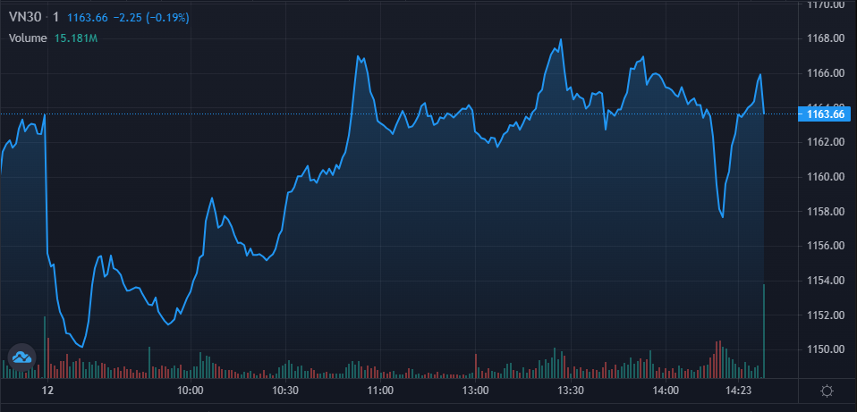 Phiên giao dịch ghi nhận sự rung lắc mạnh mẽ và đi kèm với thanh khoản tăng vọt. Ở góc nhìn kỹ thuật, trên khung 1H, lực cầu hấp thụ tại vùng 1.155 vẫn cho thấy tích cực, VN30F1M phục hồi trên MA20 kết hợp với RSI cho tín hiệu tái tích lũy tại vùng cao.
