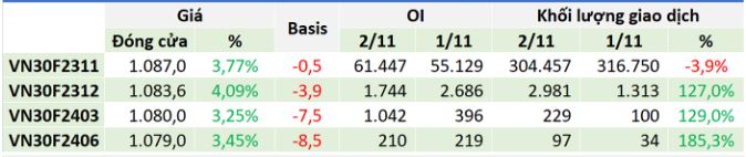 Hợp đồng VN30F2311 tăng 39,5 điểm, basis HĐTL VN30F2311 âm 0,5 điểm. Điều này cho thấy các nhà đầu tư vẫn do dự về triển vọng tăng giá ngắn hạn của chỉ số VN30. Thanh khoản VN30F2311 đạt 304.457 hợp đồng khớp lệnh trong phiên, giảm 3,45% so với phiên trước đó. Khối ngoại tiếp tục mua ròng HĐTL tháng 11 với 4.254 hợp đồng.