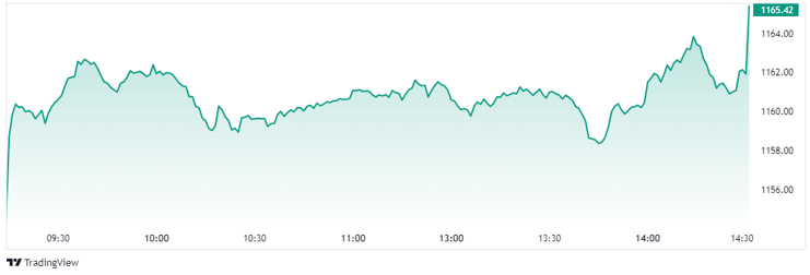 Sau nhịp mở gap tăng điểm đầu phiên, VN-Index diễn biến giằng co trong phiên trước khi mở rộng biên độ về cuối phiên. Lực mua chủ động gia tăng áp đảo bên bán đã giúp cho chỉ số tiến sát lên vùng cản gần quanh 1.16x.