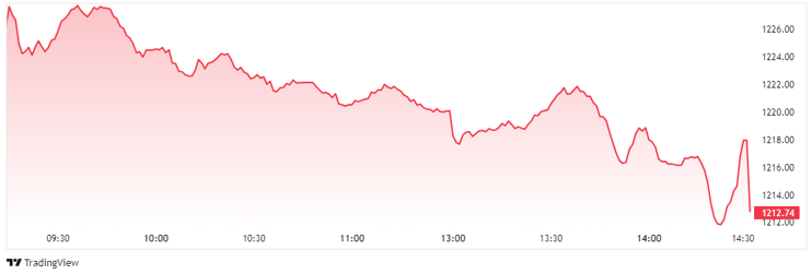 VN-Index giảm hơn 13 điểm và đóng cửa tại mốc 1.212,74 điểm. Độ rộng thị trường nghiêng về phía tiêu cực với 15/18 ngành giảm điểm, trong đó những ngành đã ghi nhận tăng trong phiên vừa qua như dịch vụ tài chính, bán lẻ, … lại giảm trong phiên ngày hôm qua. Về giao dịch của khối ngoại, hôm qua khối này tiếp tục bán ròng trên cả hai sàn HOSE và HNX.