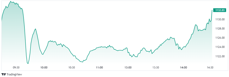 Sau nhịp rung lắc giằng co trong phiên, VN-Index dần hồi phục và đảo chiều tăng điểm về cuối phiên. Lực cầu bắt đáy gia tăng về cuối phiên đã giúp cho chỉ số chớm vượt vùng đỉnh cũ quanh 1.130 điểm.
