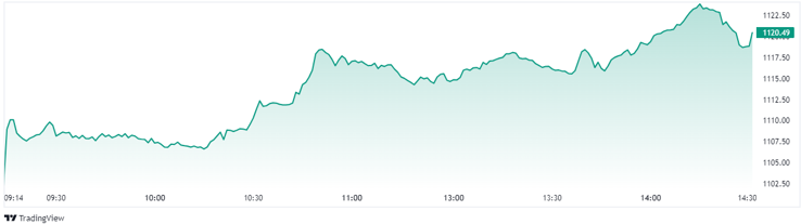 Về góc nhìn kỹ thuật, VN-Index ghi nhận lực cầu tốt và chỉ chịu áp lực bán về những phút cuối phiên khi tiếp cận lại khu vực kháng cự cũ quanh 1.125 – 1.130. Xét về khung đồ thị ngày, 2 chỉ báo MACD và RSI đều đã hướng lên tích cực trở lại và có xu hướng vượt lên trên khu vực đỉnh cũ cho thấy tín hiệu tích cực trong ngắn hạn.