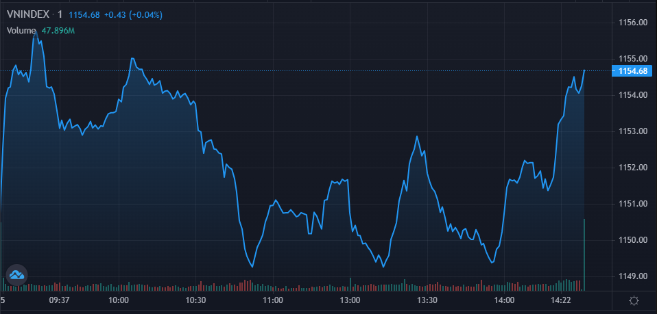 Thị trường giao dịch trong vùng 1.150-1.155 cả ngày trước khi đóng cửa tại mốc 1.154,68 điểm. Độ rộng thị trường khá cân bằng với 9/18 ngành tăng điểm, trong đó cổ phiếu nhóm bán lẻ dẫn đầu đà tăng, theo sau là ngân hàng, hóa chất. Về giao dịch của khối ngoại, họ bán ròng trên sàn HOSE và mua ròng trên sàn HNX.