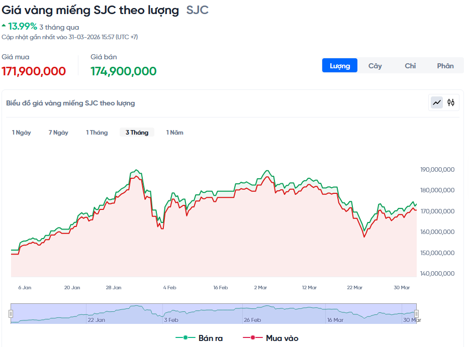 Khi giá vàng thế giới bắt đầu điều chỉnh trong tháng 3, thị trường trong nước cũng giảm theo nhưng với nhịp độ chậm hơn. Giá SJC lùi về vùng 162 triệu đồng/lượng vào hôm , tức giảm khoảng 20 triệu đồng/lượng so với đỉnh gần nhất hôm 23/3 – giảm gần 30 triệu từ đỉnh.