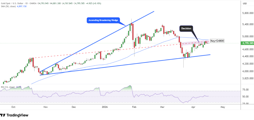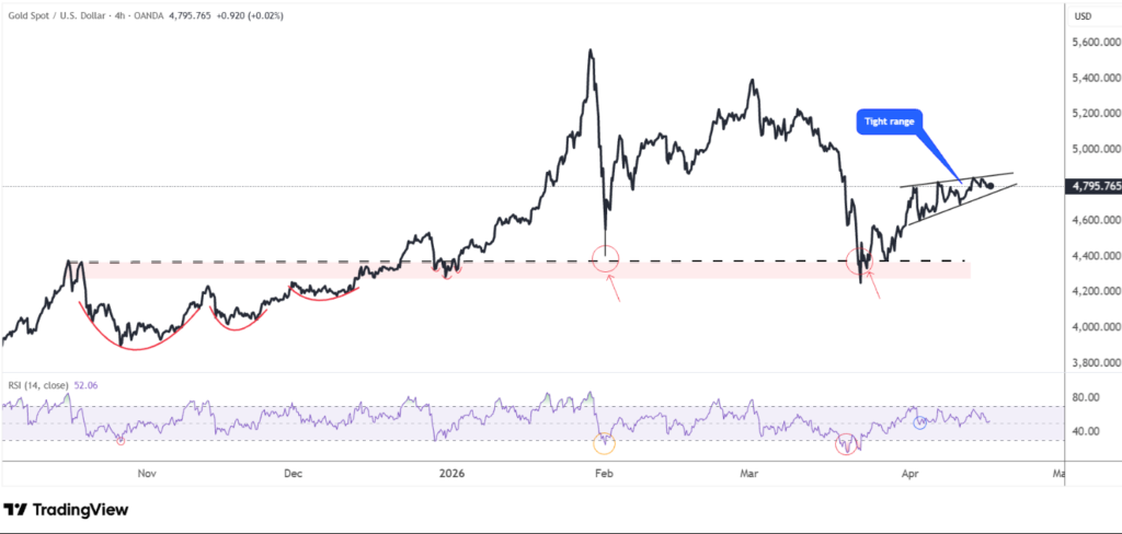 Vàng đã có hai tuần liên tiếp không thể vượt qua đường trung bình động SMA 50 ngày tại mốc $4.800. Tuy nhiên, cấu trúc biểu đồ vẫn cho thấy sự tích cực: