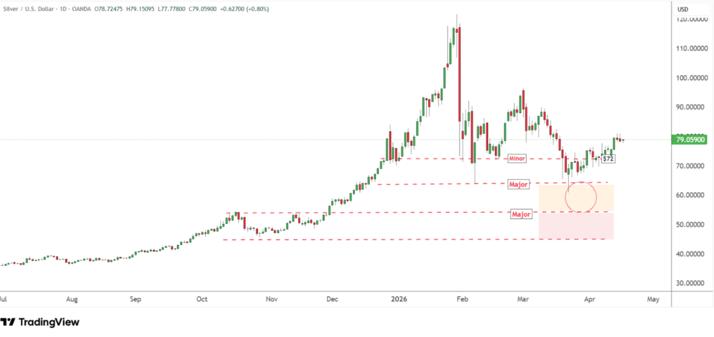 - Mục tiêu ngắn hạn: Nếu bạc vượt qua mức $81, giá có thể nhanh chóng tiến sát vùng $86 – $87. Đặc biệt, nếu phá vỡ ngưỡng $100, đó sẽ là lời khẳng định rằng thị trường đã chính thức tạo đáy thành công.