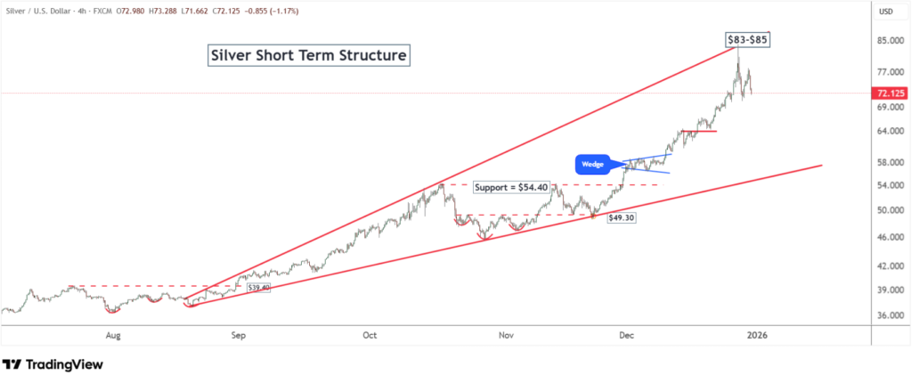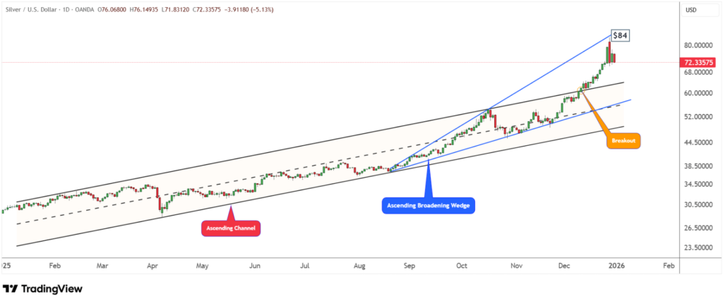 Giá bạc đã tạo đỉnh mạnh tại 84 USD – vùng kháng cự của mô hình Ascending Broadening Wedge, trước khi bước vào pha điều chỉnh cần thiết.